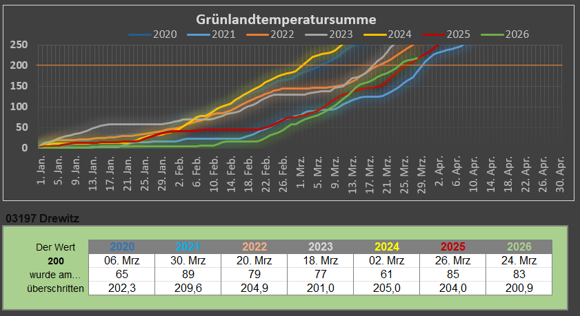 Die Vegetationssumme 2026 lag am 25. Mrz bei 53,4 Cd. Dies entspricht den Mittelwert vom 16. März. Die Natur hängt nach.